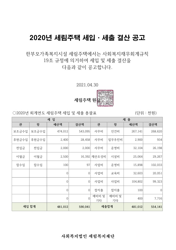 2020년 세림주택 후원금 세입 및 세출 결산 공고