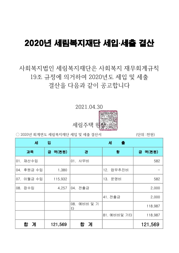 2021년사회복지법인세림복지재단세림주택후원금세입및세출결산공고
